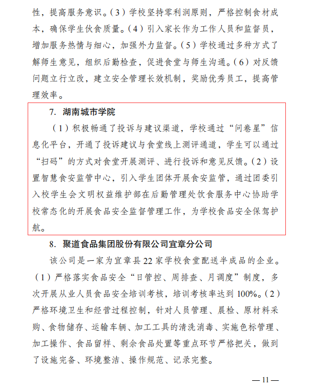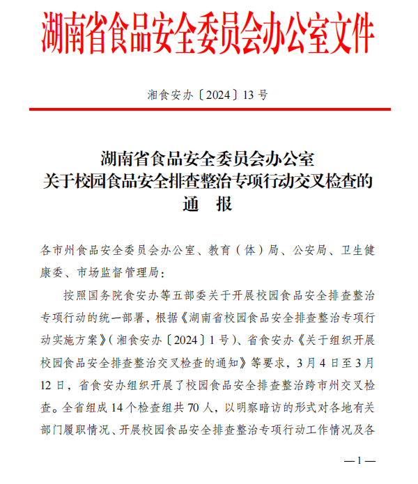 (撰稿 聂奕勋)2024年4月16日我校收到湖南省食品安全委员会文件《关于校园食品安全排查整治专项行动交叉检查的通报》,通报中对我校“积极畅通投诉与建议渠道”、“引入学生团体齐抓共管食品安全”等举措提出了表扬。