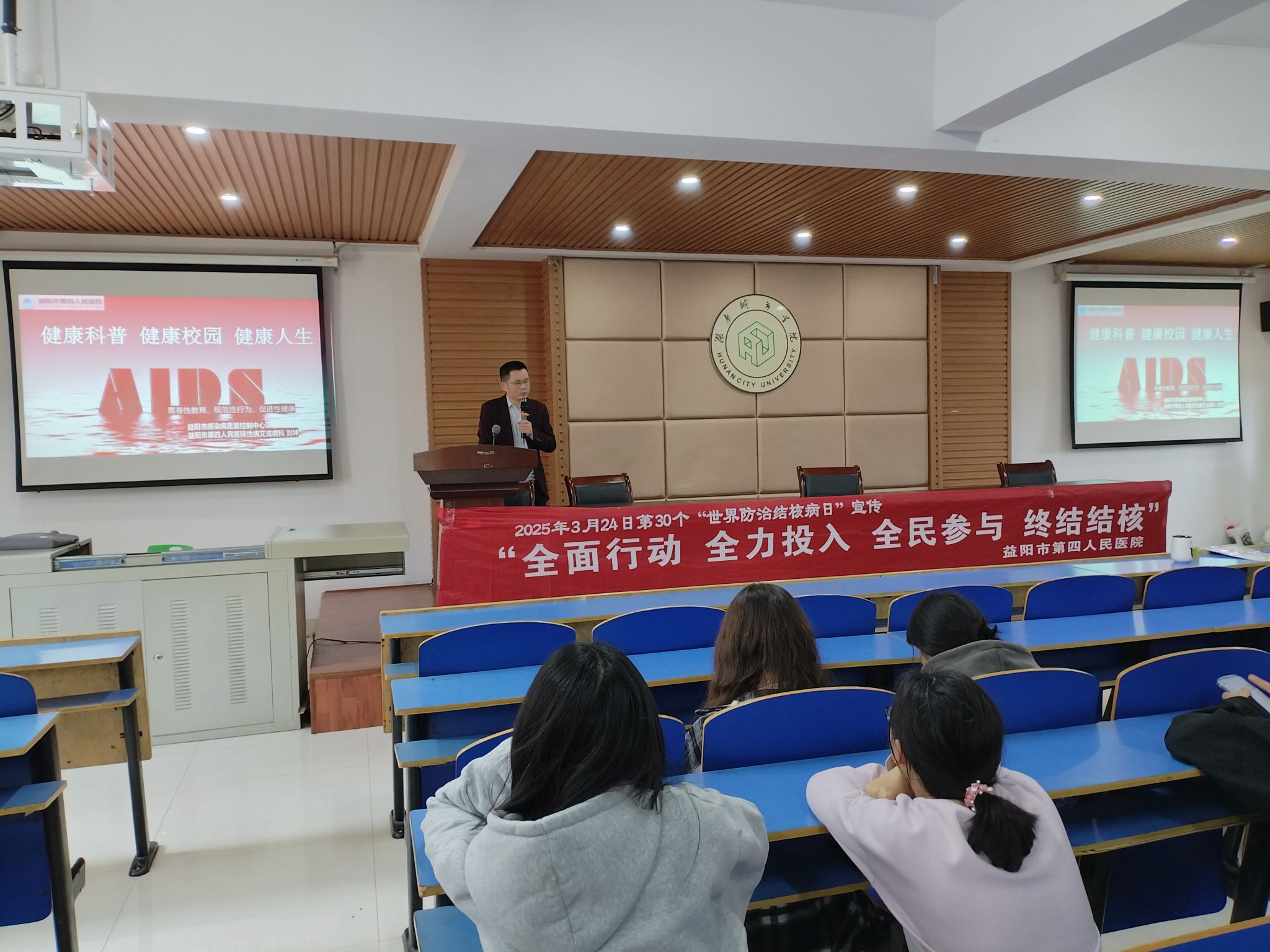 3月20日下午,学校开展了结核病防治宣教讲座。益阳市疾病预防控制中心结核病防治科科长夏哲莅临指导,益阳市第四人民医院肺病科副主任龙奇、感染康复科副主任刘坤等两位医学专家分别以“新时代结核病的防治”“结核病与艾滋病的相互关系”为题作了精彩宣讲,300多名师生聆听了专家讲课。为了增强宣讲效果,两位专家还设置了互动环节,耐心细致地为师生答疑解惑,通过有奖问答的方式,激发师生们学习结核病防治知识的积极性,师生举手答题踊跃,现场气氛热烈。